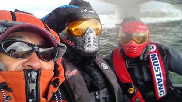 帰りは雨風が強烈で完全武装「Let’s Go!!」 お疲れ様でした、(^O^)