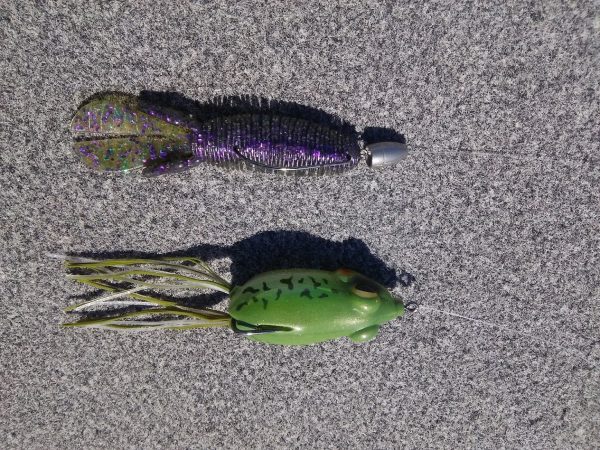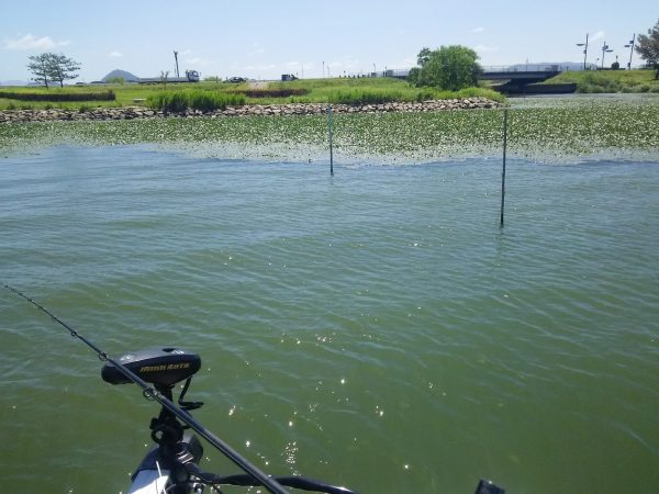 水が悪いので岸寄りにあるヒシ藻やオオカナダ藻のベッドやドームをパンチングしてみました