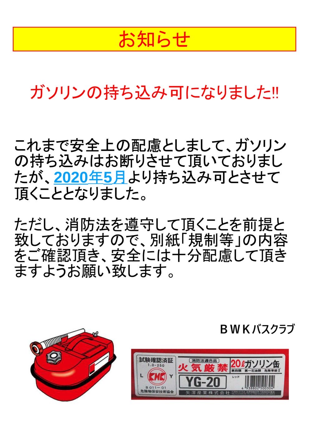 今月よりガソリンの持ち込みが可能になりました。